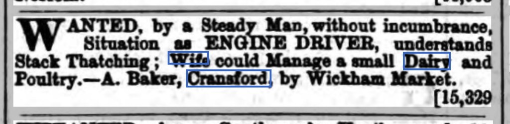 We don’t know much about Mrs Freeman from the original article but might infer she was widowed (if not, the newspaper would likely have named her husband). I suspect the article refers to a Mrs F Freeman of Valley Farm, Framsden, who advertised for a general servant in September of the same year (see ÊADT ref below this post).